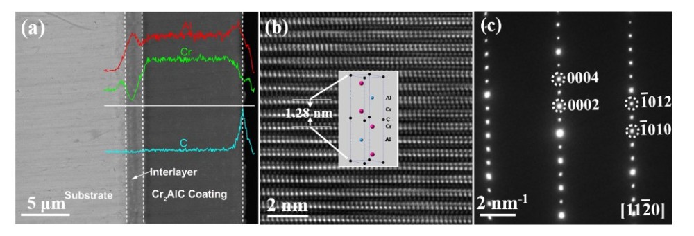 图1 (a) 电弧复合磁控溅射技术制备的Cr2AlC MAX相涂层截面形貌图,(b-c) TEM与电子衍射图